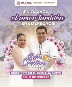 Oaxaca de Juárez, Oax. 26 de enero de 2026.- El Gobierno del Estado a través de la Dirección del Registro Civil lanza el programa Bodas Colectivas 2026, para brindar certeza jurídica, protección legal y tranquilidad a las familias oaxaqueñas, al permitirles contraer matrimonio de forma gratuita.