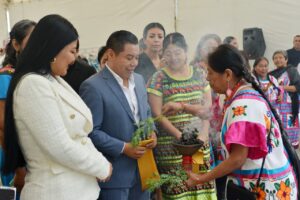 En representación de la comunidad, el Huehuentón Misael Casimiro Martínez compartió un mensaje en el que exaltó el legado cultural de la tierra de la sacerdotisa María Sabina, y el valor místico de sus artesanías.