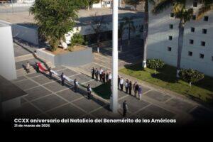 Como parte del acto conmemorativo, integrantes del presídium depositaron una ofrenda floral y montaron una guardia de honor ante la estatua de Benito Juárez García, en reconocimiento a su legado histórico y a su contribución en la transformación del país.