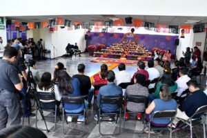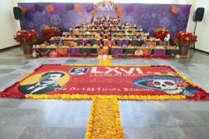 Desde muy temprano el lobby del Edificio de Diputadas y Diputados se impregnó con el aroma a copal, incienso, flores de cempasúchil y cresta de gallo; se iluminó con veladoras y se adornó con caña, papel picado de color morado, anaranjado y negro alusivos a la temporada, que fueron colocados en esta ofrenda.