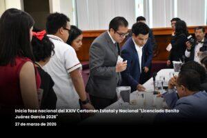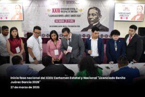 *San Raymundo Jalpan, Oax., a 27 de marzo de 2026.-* En el Congreso del Estado dio inicio la fase nacional de la edición XXIV del Certamen Estatal y Nacional de Oratoria “Licenciado Benito Juárez García 2026”, con el objetivo de fomentar la libre expresión, el pensamiento crítico y la participación de las juventudes en los asuntos públicos a través del arte de la palabra.