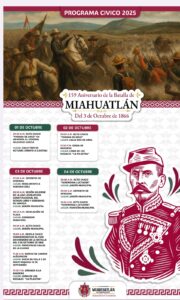 Oaxaca, Oax., 5 de septiembre de 2025.- Con gran entusiasmo, el presidente municipal de Miahuatlán de Porfirio Díaz, César Figueroa, presentó este viernes ante los medios de comunicación el programa de actividades que se desarrollarán con motivo del 159 Aniversario de la Batalla de Miahuatlán, encabezada por Don Porfirio Díaz en 1866. Las festividades se llevarán a cabo del 1 al 4 de octubre.