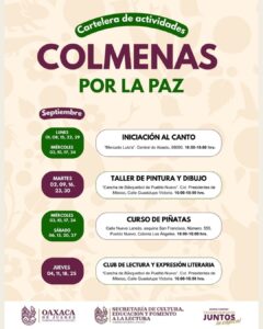 Oaxaca de Juárez, Oax., 5 de septiembre de 2025.- El Gobierno Municipal de Oaxaca de Juárez, a través de la Secretaría de Cultura, Educación y Fomento a la Lectura, invita a las vecinas y vecinos de la capital a participar en la cartelera de actividades de Colmenas por la Paz, un espacio de encuentro comunitario que promueve la convivencia, la creatividad y el aprendizaje colectivo.