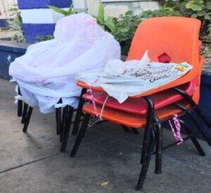 Al circular en Periférico y Nuño del Mercado, observaron a la pareja que cargaba unas sillas tipo escolar, pero al notar su presencia, las lanzaron al suelo y comenzaron a correr.