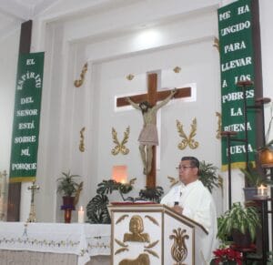Parroquia de Nuestra Señora del Rosario, Oax., Enero 24, 2025. “El Espíritu del Señor está sobre mí, porque me ha ungido para llevar a los pobres la buena nueva”, consignaba la palabra del Evangelio, a través de dos lienzos ubicados en el altar de este templo parroquial de esta unidad habitacional, en el marco de la celebración Eucarística, presidida por el presbítero Ricardo Vásquez Ojeda, para con ello, transmitir y llevar el Evangelio a todas y todos los católicos de esta demarcación perteneciente a San Sebastián Tutla.